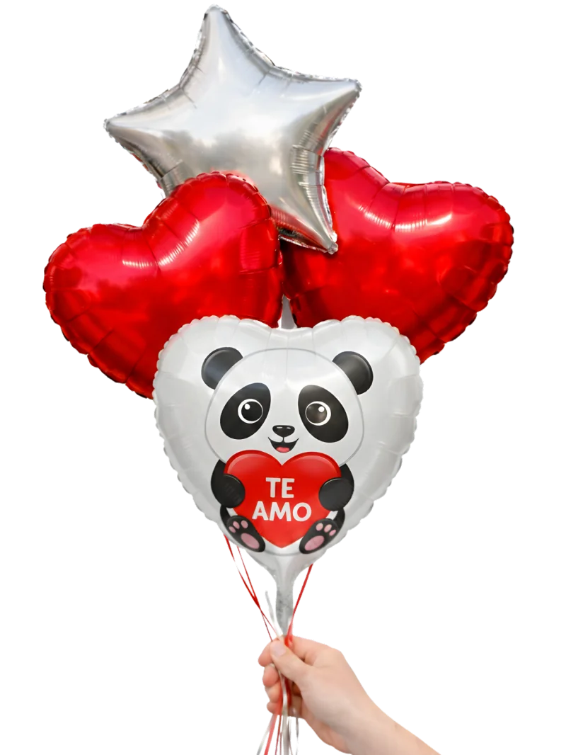 Incluye 4 globos metalizados con helio: 3 de forma de corazón o estrella, y 1 globo de aprox 43 cm impreso, tu eliges un modelo de los disponibles en la sección de globos grandes.