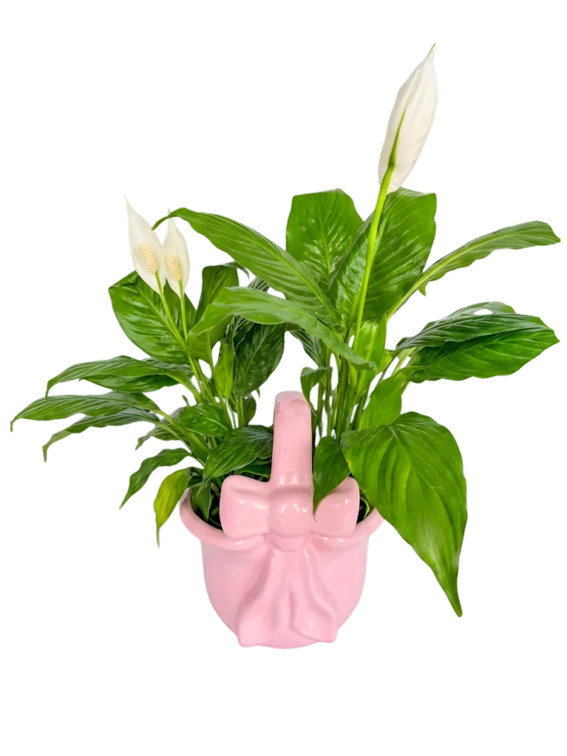 • Planta Cuna de Moisés (Espatifilo), maceta rosa decorativa, sobre, tarjeta para dedicatoria.