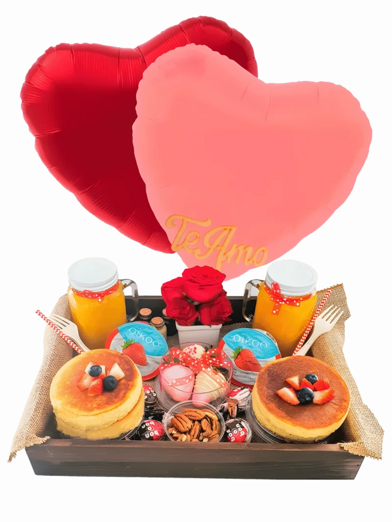 Una increíble desayuno para parejas, para disfrutar entre dos. Sorprende de una manera especial, con una bandeja de alimentos frescos, y unos hermosos y esponjosos hotcakes... ¡conquístale desde el paladar!