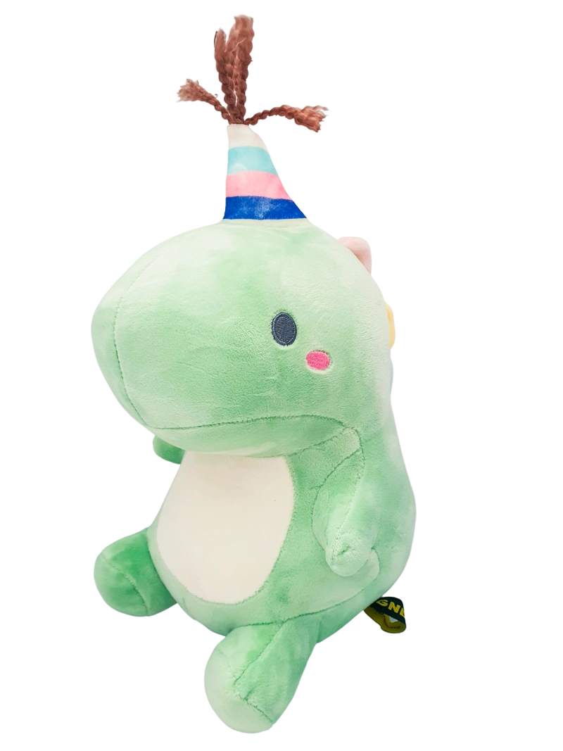 Peluche en forma de dinosaurio con gorrito de fiesta aprox 22cm.